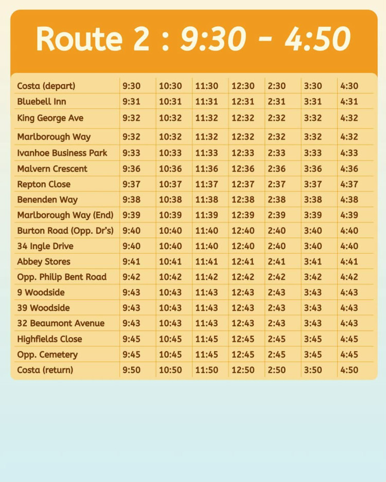 The hopper bus will have two routes, both starting and ending by Costa. Route 1 will cover from Willesley to Tesco Extra and Route 2 will cover Malvern Crescent to Westfields.