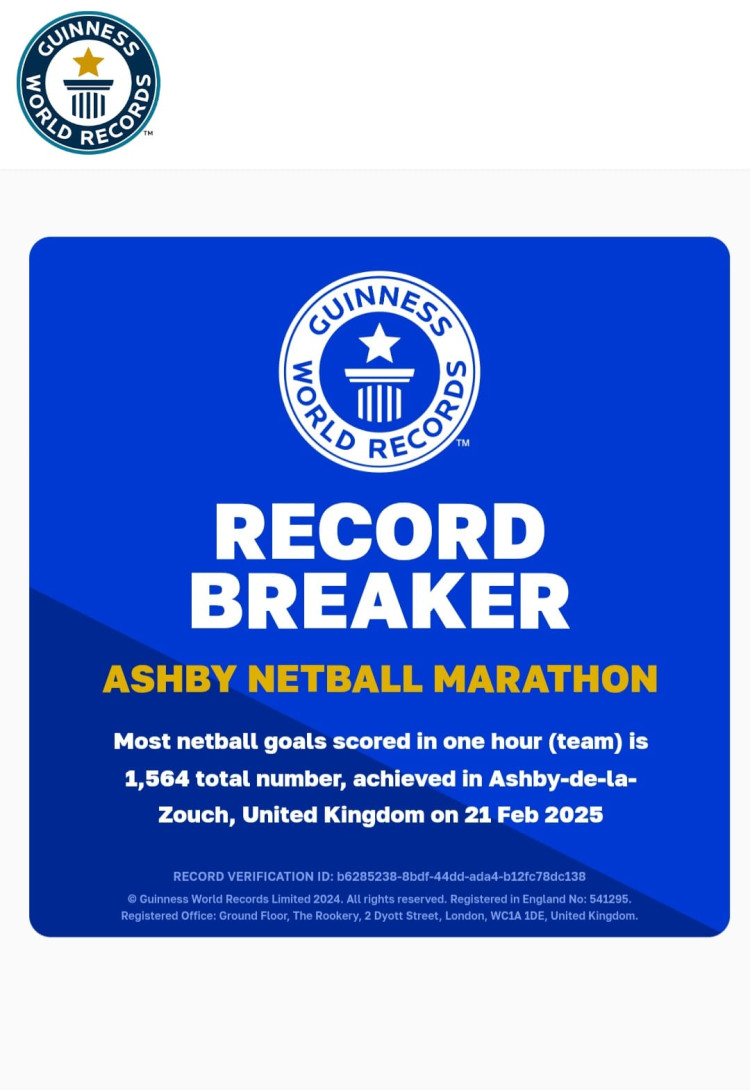 The Guinness World Records team has now officially verified the feat, cementing Ashby Netball Club's place in sporting history.