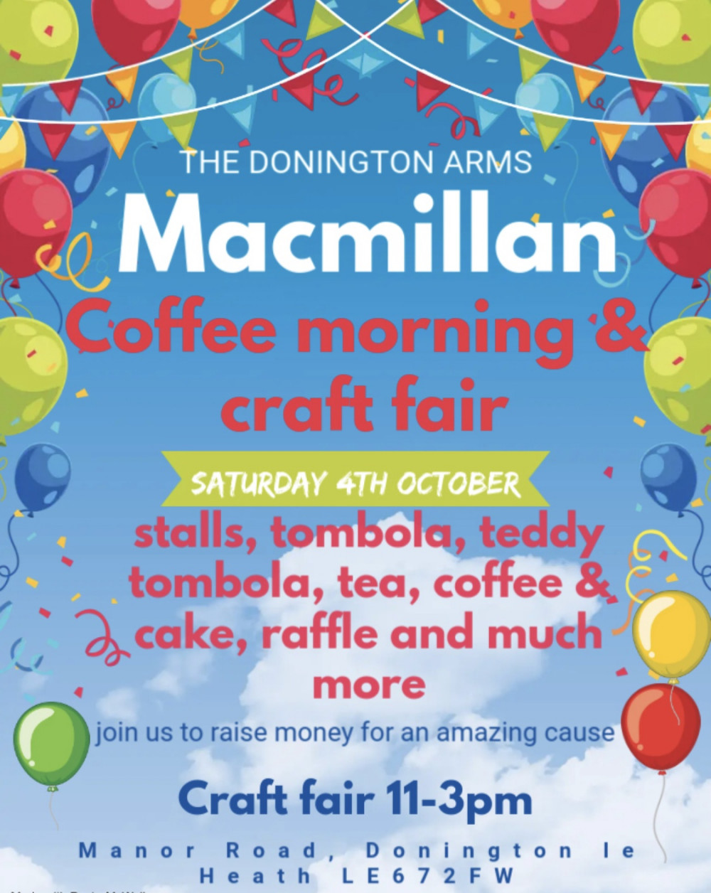 On Saturday 4th October between 11am to 3pm, The Donington Arms is hosing a Macmillan coffee morning and craft fair.
