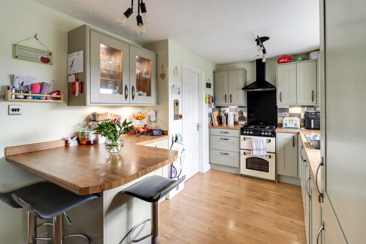 The kitchen is built around a large peninsula, ideal for casual breakfasts or meal preparation. This leads seamlessly into a well-organized utility room, which neatly houses the boiler, appliances, and benefits from an extra pantry space which was added when the garage was converted.
