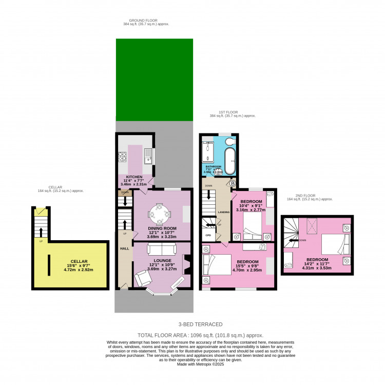 Upstairs, the first floor offers two comfortable double bedrooms, both with chimney breast features adding a touch of character. The four-piece family bathroom is stylish and well-appointed, complete with a separate shower and bath. The second floor is home to a further double bedroom, made bright and airy by a lovely skylight window.
